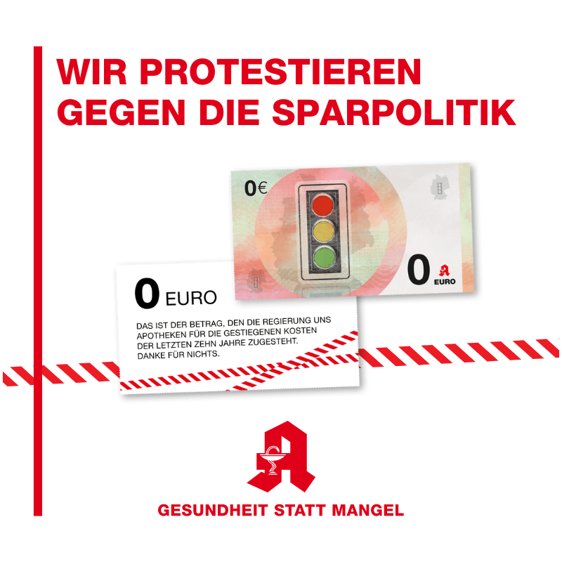 Vielleicht hast du von deinem letzten Besuch in der Apotheke einen 0-Euro-Schein mitgenommen. Mit diesem Schein protestieren wir gegen die Sparpolitik der Bundesregierung. Denn die finanzielle Situation unserer Apotheken ist alarmierend.