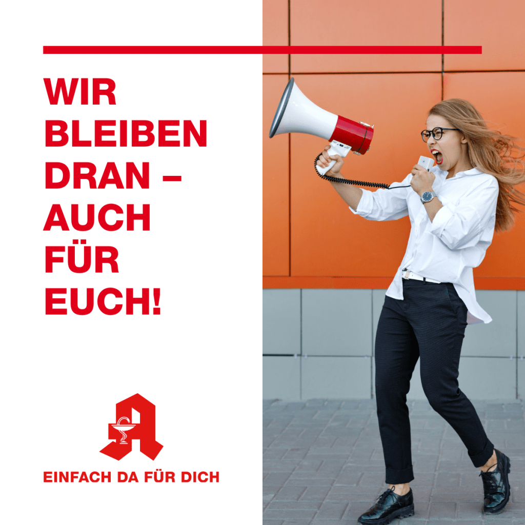 In der vergangenen Woche haben wir und tausende Apotheken in Deutschland gegen die Sparpolitik im Gesundheitswesen demonstriert – mit geschlossenen Apotheken und Protestaktionen im ganzen Land. Wir setzen uns weiterhin für eine wohnortnahe, zuverlässige Arzneimittelversorgung ein. Denn wir wollen euch optimal versorgen – ohne Lieferengpässe, mit weniger Bürokratie für uns und mehr Zukunftsaussichten für unseren Nachwuchs!